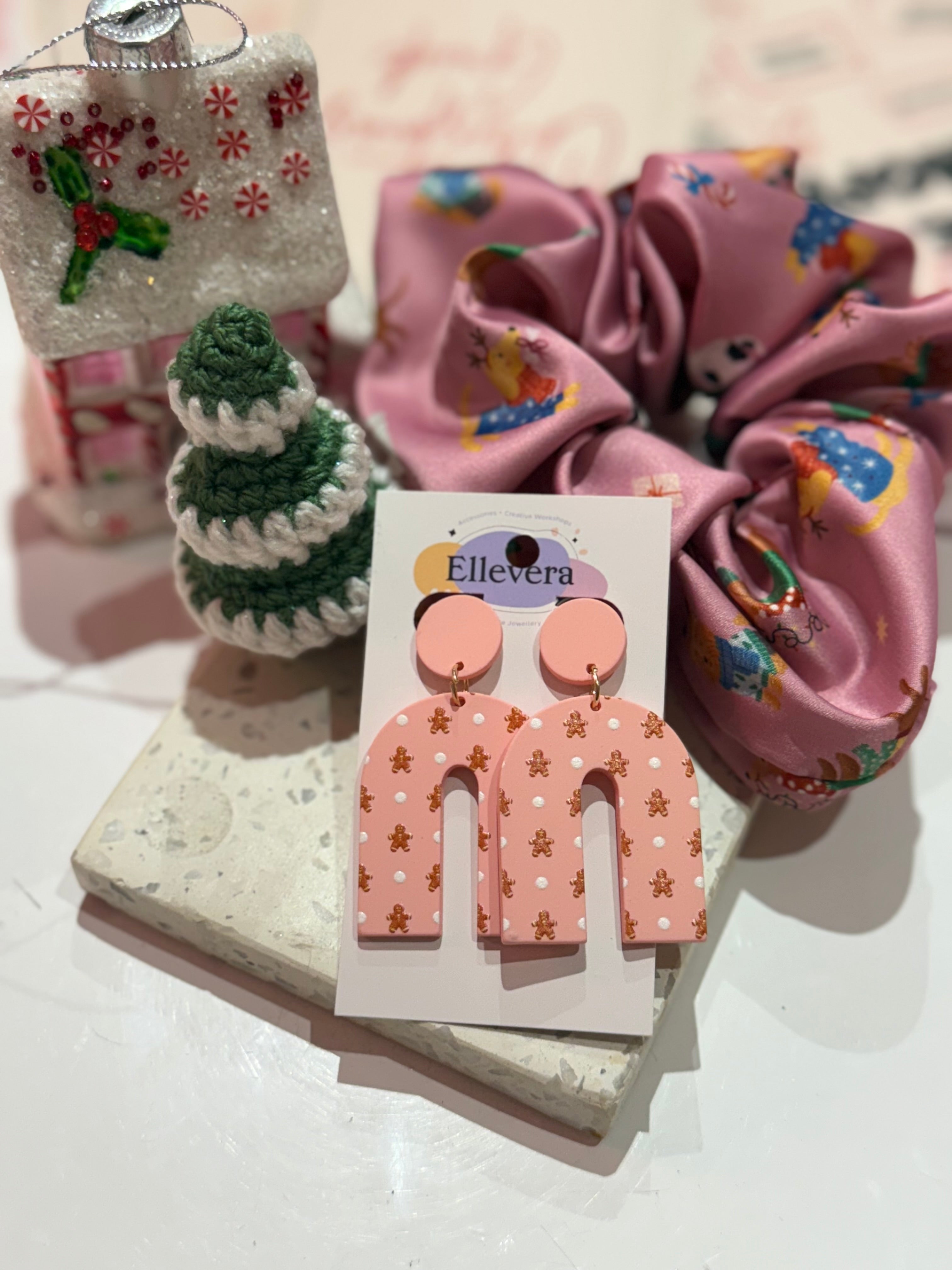 Sweeten up your holiday style with these adorable pink gingerbread acrylic earrings! Featuring a playful arch design with mini gingerbread men and white polka dots, they’re the cutest statement accessory for the festive season 🎄✨